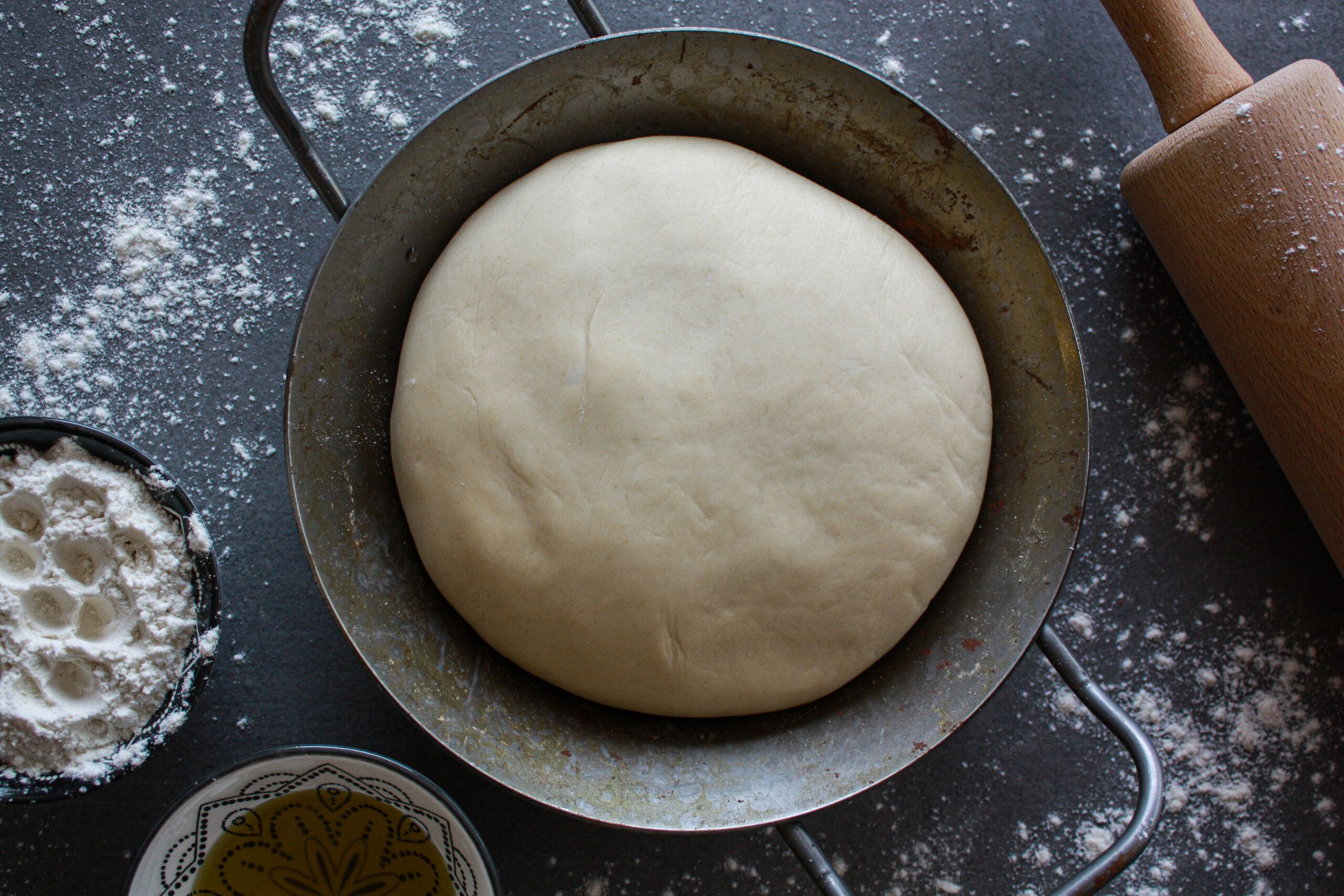 1. Mehl, Wasser, Öl und Salz in eine Küchenmaschine geben und mit einem Knethacken (oder Knetmesser) zu einer homogenen Masse verrühren. Den Teig aus der Küchenmaschine geben und anschließend noch ca. 5 Minuten mit den Händen geschmeidig kneten. (Ist keine Küchenmaschine vorhanden-einfach die Hände benutzen).